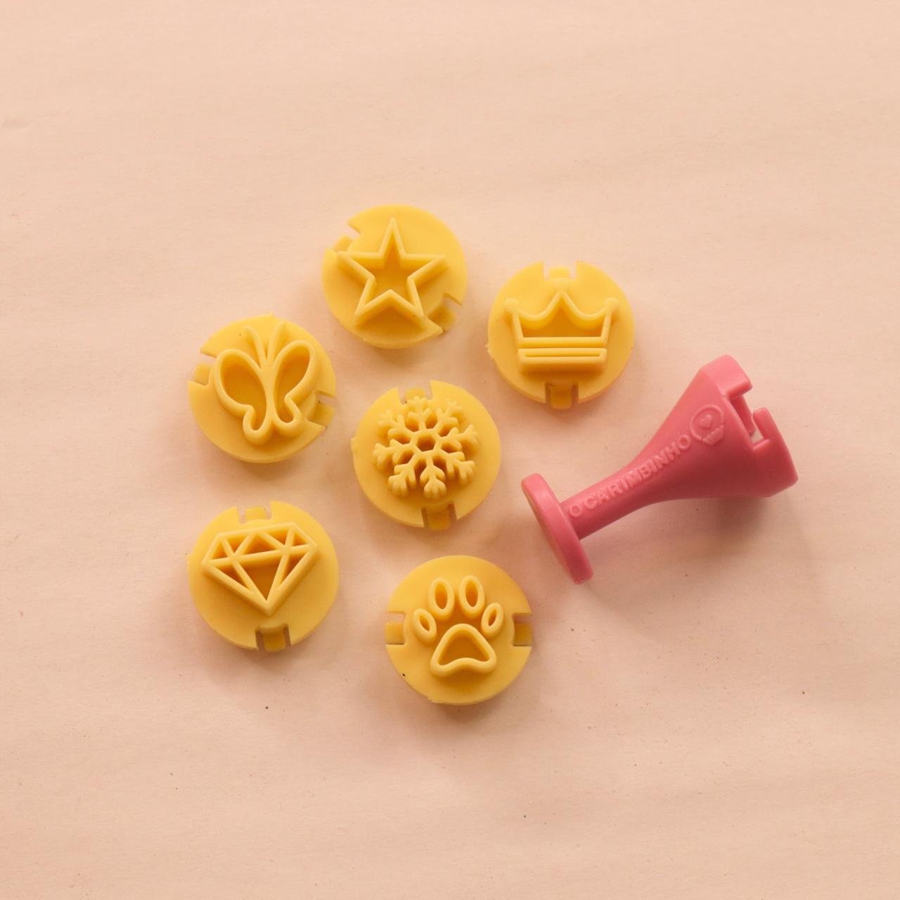 O Kit Carimbos para Brigadeiros Diversos 2 é composto por 8 (oito) peças, sendo 2 (duas) bases de fixação e as cabeças para marcação com uma borboleta, uma patinha, um floco de neve, um diamante, uma coroa e uma estrela. Com ele você fará marcações diretamente no brigadeiro a ser decorado, trazendo um efeito especial para seus brigadeiros.